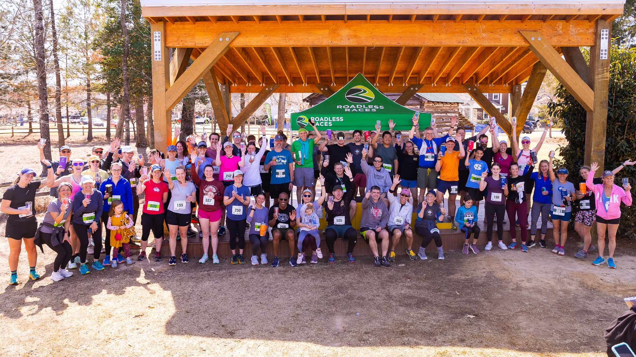 Racers and volunteers are invited to join the contests – fun stuff such as push-ups, sprint, squat, cornhole, rock/paper/scissors, etc, etc. Contest winners receive NICE swag like Goodr sunglasses or race merchandise and ALL who participate receive an item of swag. After the contests, we randomly select winners of the rest of the swag – more great stuff such as Goodr sunglasses, gift certificates, running gear, and Roadless Races merchandise.